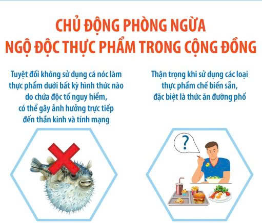 Nguy cơ ngộ độc thực phẩm tiềm ẩn trong cả thực phẩm tự nhiên và thực phẩm chế biến sẵn. Người dân tuyệt đối không sử dụng cá nóc làm thực phẩm dưới bất kỳ hình thức nào do chứa độc tố nguy hiểm, có thể gây ảnh hưởng trực tiếp đến thần kinh và tính mạng. Đồng thời, cần thận trọng khi sử dụng các loại thực phẩm chế biến sẵn, đặc biệt là thức ăn đường phố; lựa chọn cơ sở uy tín, bảo đảm điều kiện vệ sinh an toàn thực phẩm…