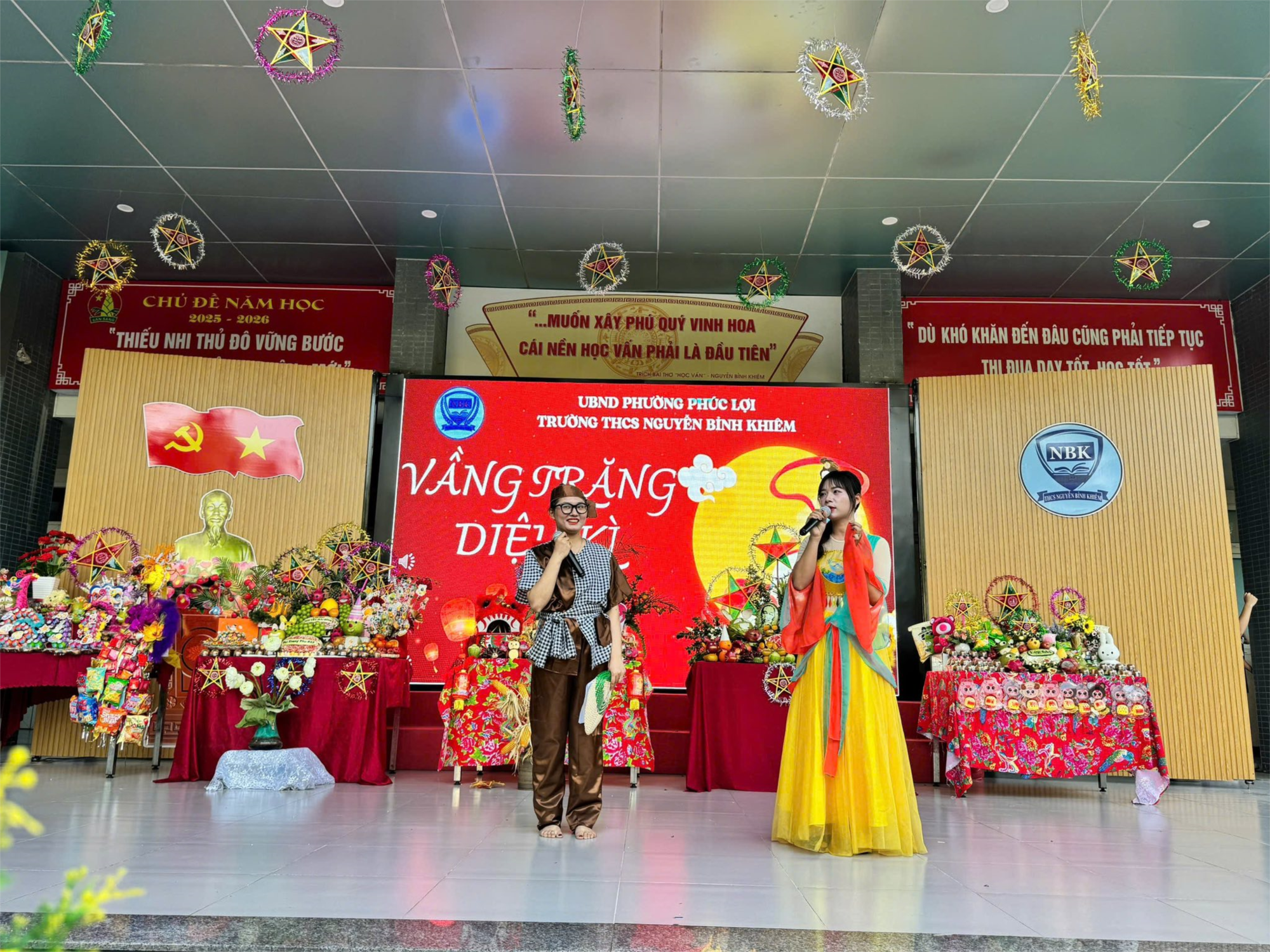 mái trường THCS Nguyễn Bỉnh Khiêm lại rộn ràng tiếng cười, ngập tràn sắc màu yêu thương. Trung Thu năm nay các em học sinh được gặp chú Cuội, chị Hằng và thưởng thức những tiết mục văn nghệ đặc sắc đến từ các lớp. Các em học sinh còn được tham gia các trò chơi dân gian như ô ăn quan, nhảy dây, bịt mắt đánh trống, ném vòng cổ chai.