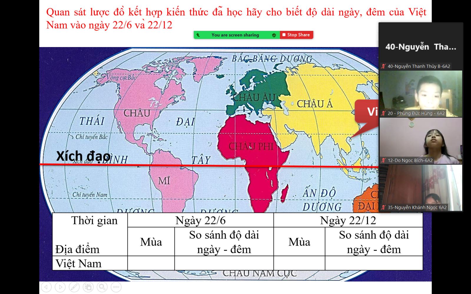Môn Địa lí 6, bài “Bài 8. CHUYỂN ĐỘNG CỦA TRÁI ĐẤT QUAY QUANH MẶT TRỜI VÀ HỆ QUẢ”, do cô giáo Nguyễn Thị Thu Thủy thực hiện. Với mục tiêu sử dụng phương pháp quan sát, … để tìm hiểu Chuyển động của trái đất quanh mặt trời, cô giáo Nguyễn Thủy đã giúp học sinh tìm hiểu kiến thức một cách chủ động, sáng tạo. Thông qua loạt nhiệm vụ học tập liên tiếp, học sinh đã được tham gia các hoạt động phong phú như trò chơi, thảo luận, theo dõi clip. Một điều xuyên suốt tiết học đó là đối với mỗi hoạt động cô giáo luôn đưa ra mục tiêu rõ ràng, có hoạt động phù hợp; đặc biệt hs được phân tích kết quả quan sát để chứng minh mục tiêu cần đạt. Điều này khiến cho bài học trở nên mới mẻ, sinh động, logic và phát huy tối đa tinh thần sáng tạo của học sinh. Giúp học sinh trau dồi nhiều kiến thức, kỹ năng như vậy, nhưng tiết học không hề nặng nề, khô khan, mà ngược lại, vô cùng sôi nổi và hào hứng. Tiết học càng trở gần gũi và gắn bó hơn với đời sống thông qua hoạt động tìm các câu ca dao, tục ngữ nói về hiện tượng ngày và đêm của ông cha ta. Các nhóm học sinh đã rất hào hứng với phần nội dung này dưới hình thức một trò chơi.