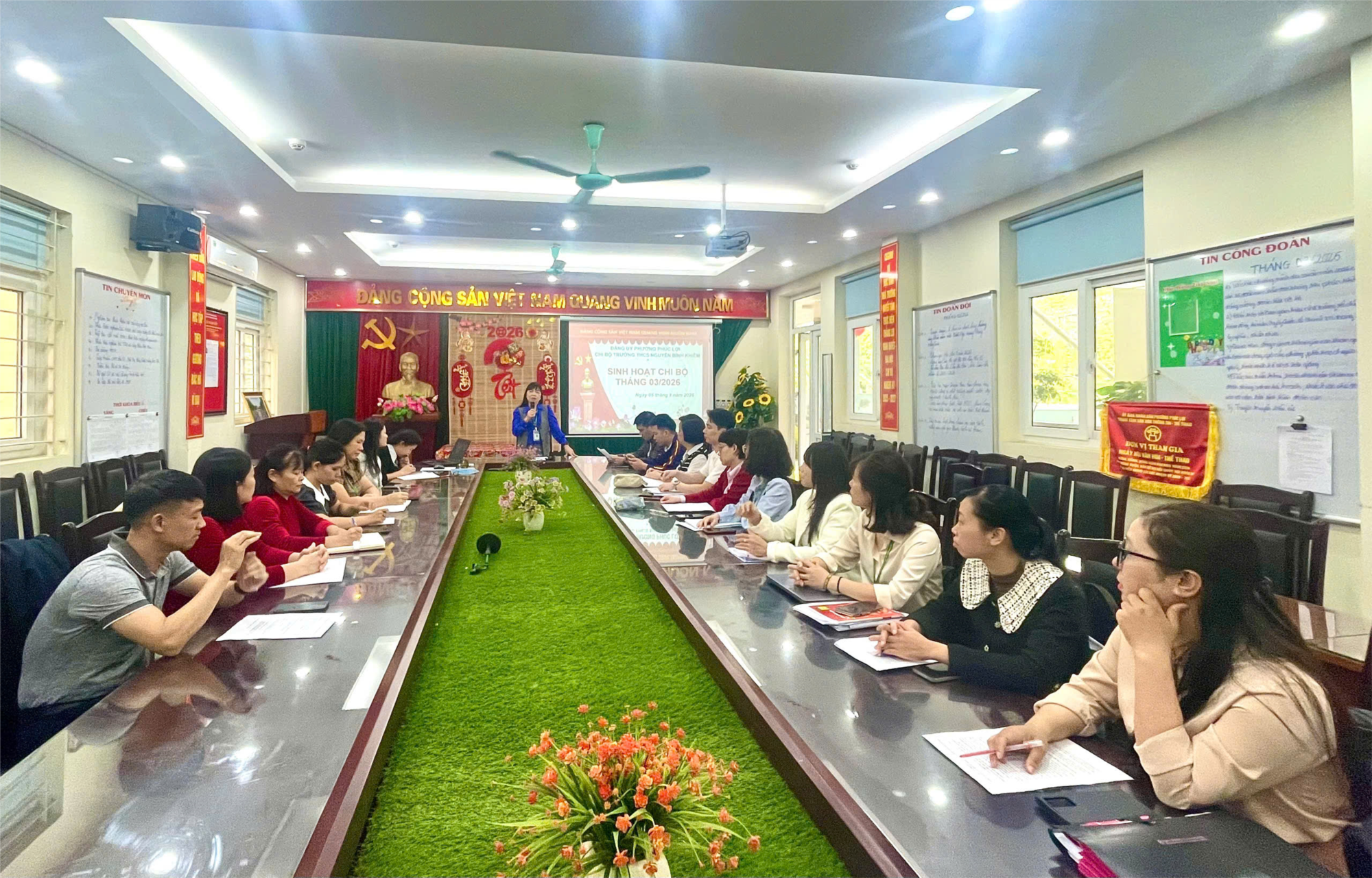 Bên cạnh nội dung học tập Nghị quyết, Chi bộ đã đánh giá kết quả thực hiện nhiệm vụ tháng 2/2026, ghi nhận những kết quả đạt được trong công tác chuyên môn, công tác xây dựng Đảng và các hoạt động phong trào của nhà trường. Đồng thời, Chi bộ thẳng thắn chỉ ra những hạn chế cần khắc phục, đề ra phương hướng, nhiệm vụ trọng tâm tháng 3/2026, tập trung vào việc nâng cao chất lượng dạy học, chuẩn bị tốt công tác kiểm tra giữa kỳ, đẩy mạnh các phong trào thi đua chào mừng các ngày lễ lớn trong tháng 3.