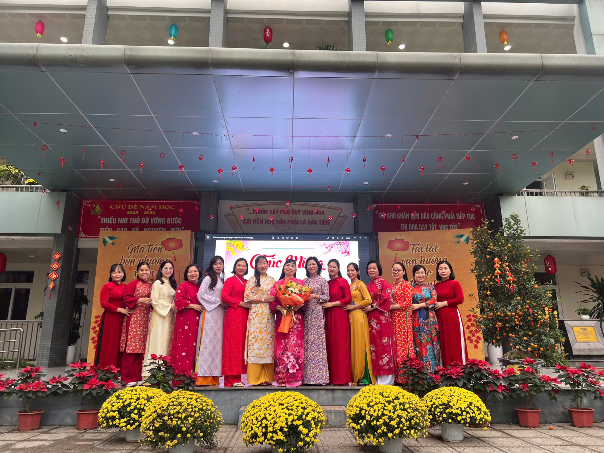 Tháng Ba về mang theo những tia nắng dịu dàng của cuối xuân, khi hương hoa bưởi thoang thoảng trong gió và sắc trời như trong trẻo hơn sau những ngày mưa phùn. Trong không gian thân quen của mái trường THCS Nguyễn Bỉnh Khiêm, tà áo dài Việt Nam lại thướt tha hiện diện, nhẹ nhàng mà duyên dáng. Mỗi bước chân của các đ/c nữ cán bộ, giáo viên, nhân viên trong tà áo dài truyền thống như mang theo nét đẹp nền nã, thanh lịch – một vẻ đẹp rất riêng của người phụ nữ Việt Nam. Giữa nhịp sống tất bật của những giờ lên lớp, hình ảnh ấy càng làm cho sân trường thêm ấm áp, dịu dàng và đầy cảm hứng.