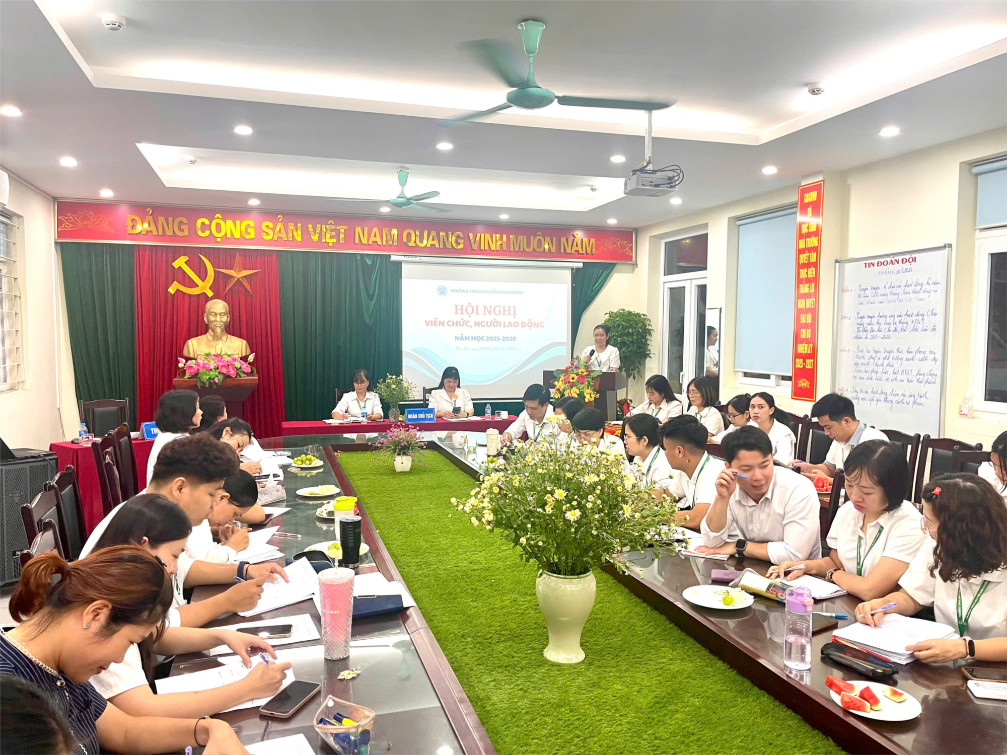 Hội nghị cán bộ công chức, viên chức và người lao động năm học 2025-2026 của trường THCS Nguyễn Bỉnh Khiêm đã thành công tốt đẹp tạo ra không khí thi đua sôi nổi. Hội nghị đã thông qua Nghị quyết với các nội dung: công tác chính trị tư tưởng; công tác thi đua; sự phối hợp với thủ trưởng cơ quan đơn vị với BCH công đoàn, đồng thời kêu gọi toàn thể CBVCNLĐ phát huy những thành tích đã đạt được, phấn đấu thực hiện thắng lợi nhiệm vụ chính trị, tích cực đóng góp công sức và trí tuệ xây dựng Nhà trường ngày một vững mạnh và phát triển./.