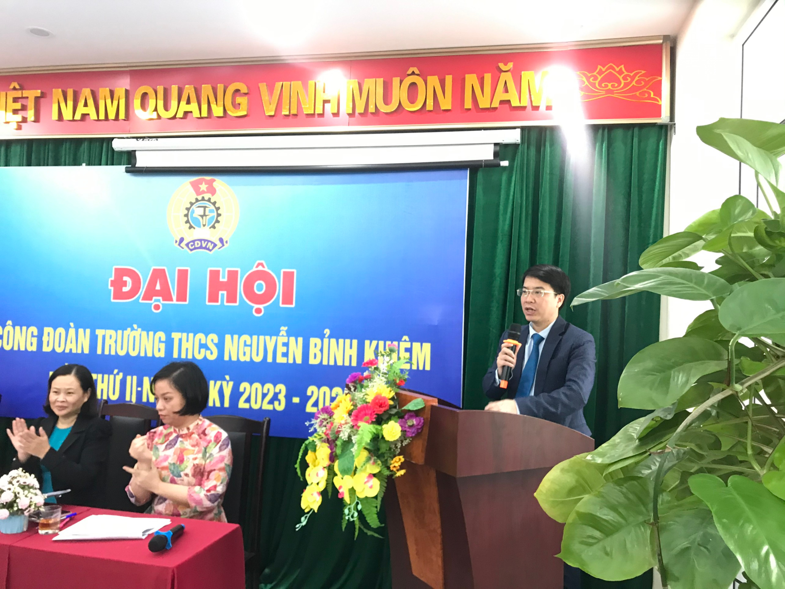 V, nhiệm kì 2023 – 2028. Tiếp đó, Đại hội đã được lắng nghe những ý kiến chỉ đạo vô cùng quý báu và thiết thực của đồng chí Nguyễn Trường Giang– Phó chủ tịch liên đoàn lao động quận Long Biên; đồng chí Võ Hương Lam– Bí thư chi bộ nhà trường đại diện cấp ủy đã phát biểu và giao nhiệm vụ cho Ban chấp hành Công đoàn, đoàn viên Công đoàn