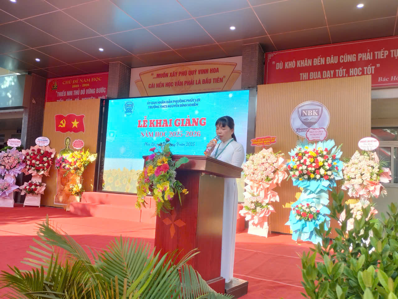 Tiếp nối chương trình, cô Võ Hương Lam – Bí thư Chi bộ, Hiệu trưởng nhà trường đã thay mặt tập thể cán bộ giáo viên nhân viên và học sinh nhà trường lời cảm ơn chân thành nhất tới các đ/c lãnh đạo, các cơ quan, ban, ngành, đoàn thể địa phương, các bác lãnh đạo tổ dân phố, Hội Cha mẹ học sinh nhà trường cùng các công ty, đối tác liên kết đã gửi cây hoa, cây xanh, lãng hoa chúc mừng nhà trường nhân ngày khai giảng năm học mới.