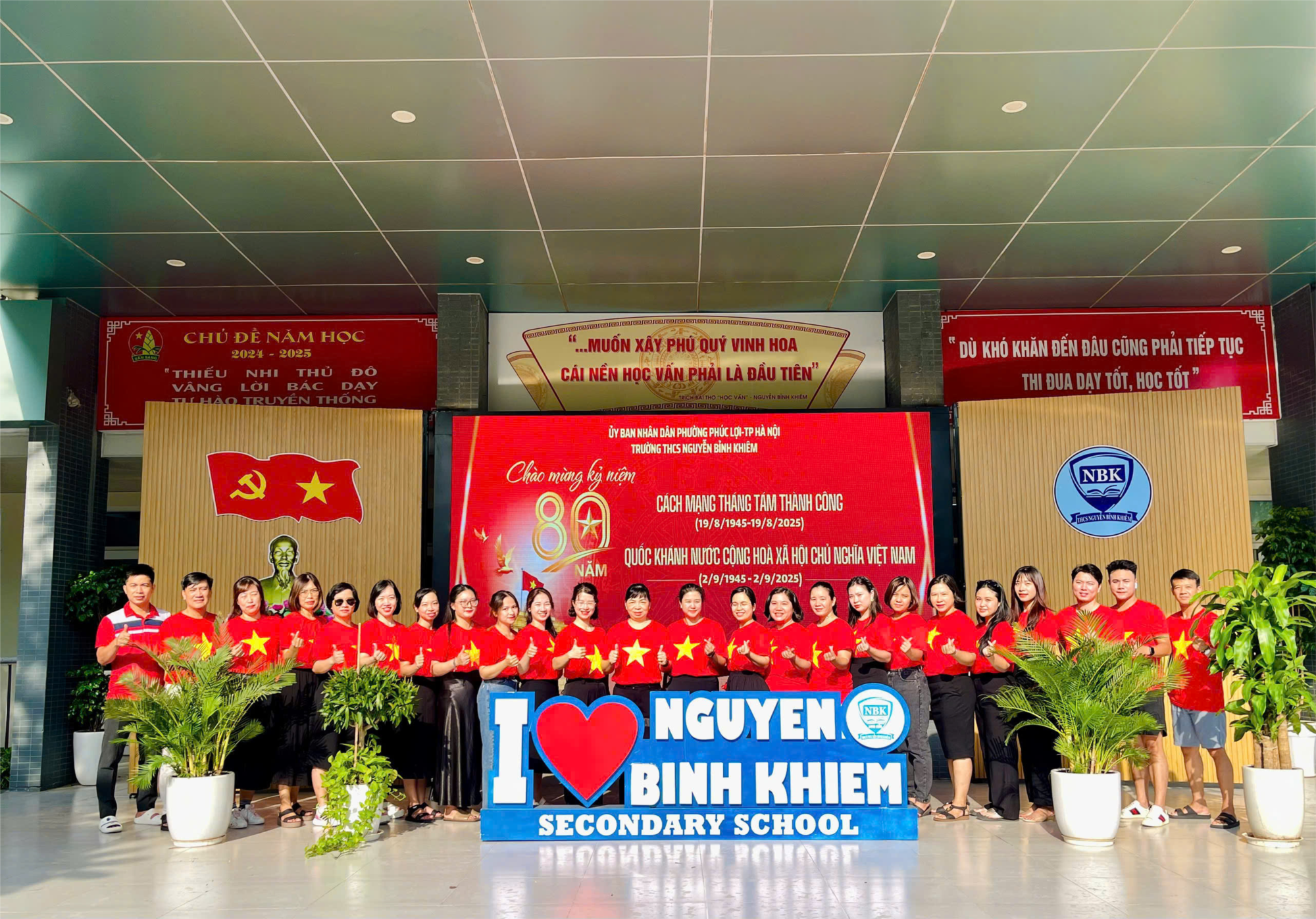 Thực hiện Kế hoạch số 36/KH-UBND ngày 5/8/2025 của UBND phường Phúc Lợi về Tổ chức cuộc thi Phúc Lợi Sáng - Xanh - Sạch - Đẹp, tuyên truyền cổ động trực quan chào mừng 80 năm Cách mạng Tháng 8, Quốc khánh 2/9 và Đại hội Đảng bộ phường lần thứ I nhiệm kỳ 2025-2030. CBGVNV trường THCS Nguyễn Bỉnh Khiêm nhiệt liệt chào mừng 80 năm Cách mạng Tháng Tám (19/8/1945-19/8/2025), Quốc khánh Nước CHXHCN Việt Nam (2/9/1945-2/9/2025) và chào mừng Đại hội Đảng bộ phường Phúc Lợi lần thứ I nhiệm kỳ 2025-2030.